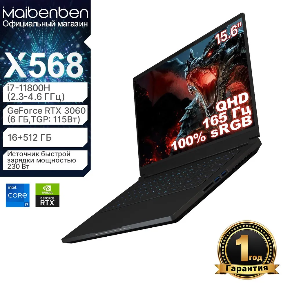 MAIBENBEN X568 RTX3060(6GB) 2.5K QHD(2560x1440) IPS 165Hz 100%sRGB Игровой ноутбук 15.6", Intel Core i7-11800H, RAM 16 ГБ, SSD 512 ГБ, NVIDIA GeForce RTX 3060 (6 Гб), Linux, черно-серый, Английская раскладка